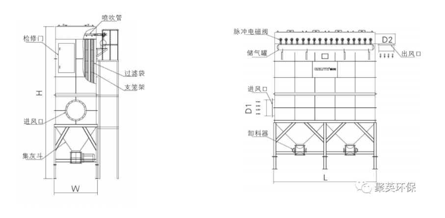 含塵氣體進(jìn)入脈沖袋式除塵器,氣流流經(jīng)灰斗,流速放慢,慣性作用使粗顆粒粉塵直接落入灰斗。起預(yù)收塵的作用,氣流隨后通過(guò)內(nèi)部裝有金屬骨架的濾袋,粉塵被捕集在濾袋表面,凈化后氣體匯集到出風(fēng)口排出,除塵器運(yùn)行過(guò)程中,積附在濾袋上的粉塵越來(lái)越多,濾袋阻力增加,處理風(fēng)量逐漸減少,為正常工作,需對(duì)濾袋進(jìn)行清灰,由脈沖控制程序控制脈沖閥開(kāi)啟,壓縮空氣由噴吹管各孔經(jīng)文氏管噴射到濾袋內(nèi),濾袋瞬間急劇膨脹,使積附在濾袋表面的粉塵脫落。清下粉塵落入灰斗,經(jīng)排灰系統(tǒng)排出機(jī)體。由此使積附在濾袋上的粉塵周期地脈沖噴吹清灰,使脈沖布袋除塵器始終保持高效運(yùn)行狀態(tài)。
