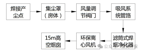 焊接點 →半封閉房體 → 吸風管路 →濾筒式焊煙凈化器 → 風機 → 煙囪(室外鋼平臺支撐)