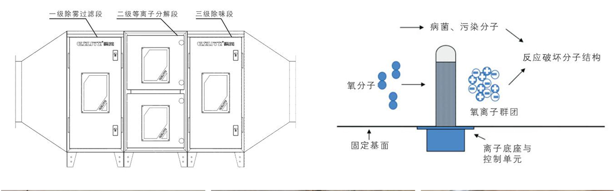 低溫等離子體”是電子、化學、催化等綜合作用下的電化學過程,是依靠等離子體在瞬間產(chǎn)生的強大電場能量電離、裂解有害氣體的化學鍵能,從而破壞廢氣分子結(jié)構(gòu),達到凈化目的。